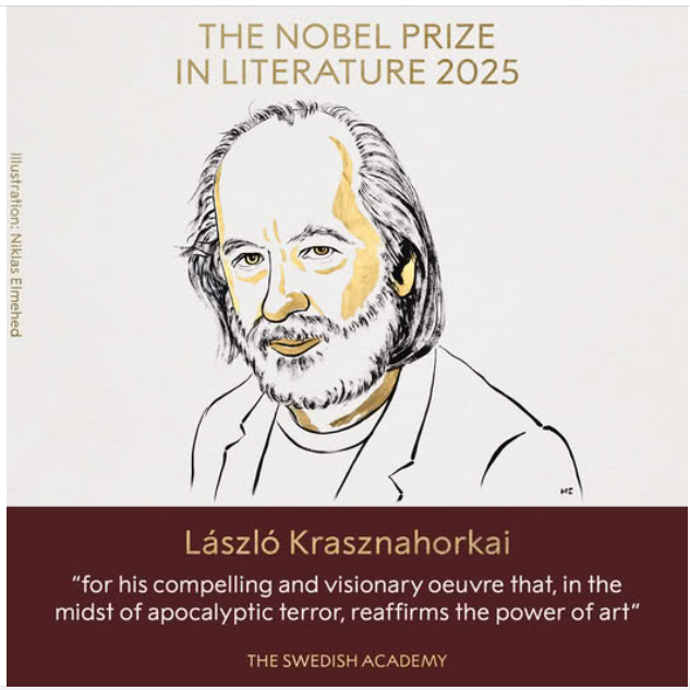 László Krasznahorkai, escritor húngaro é o vencedor do Prémio Nobel de Literatura 2025 , “pela sua obra convincente e visionária que, no meio do terror apocalíptico, reafirma o poder da arte. ”