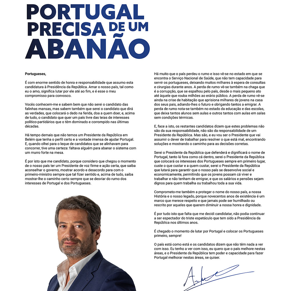 Nas eleições de 18 de janeiro, será escolhido o Presidente da República que irá suceder ao atual presidente Marcelo Rebelo de Sousa, que cumpre o seu segundo mandato no período 2021–2026.Imagem disponibilizada no site do candidato com a sua declaração de candidatura.