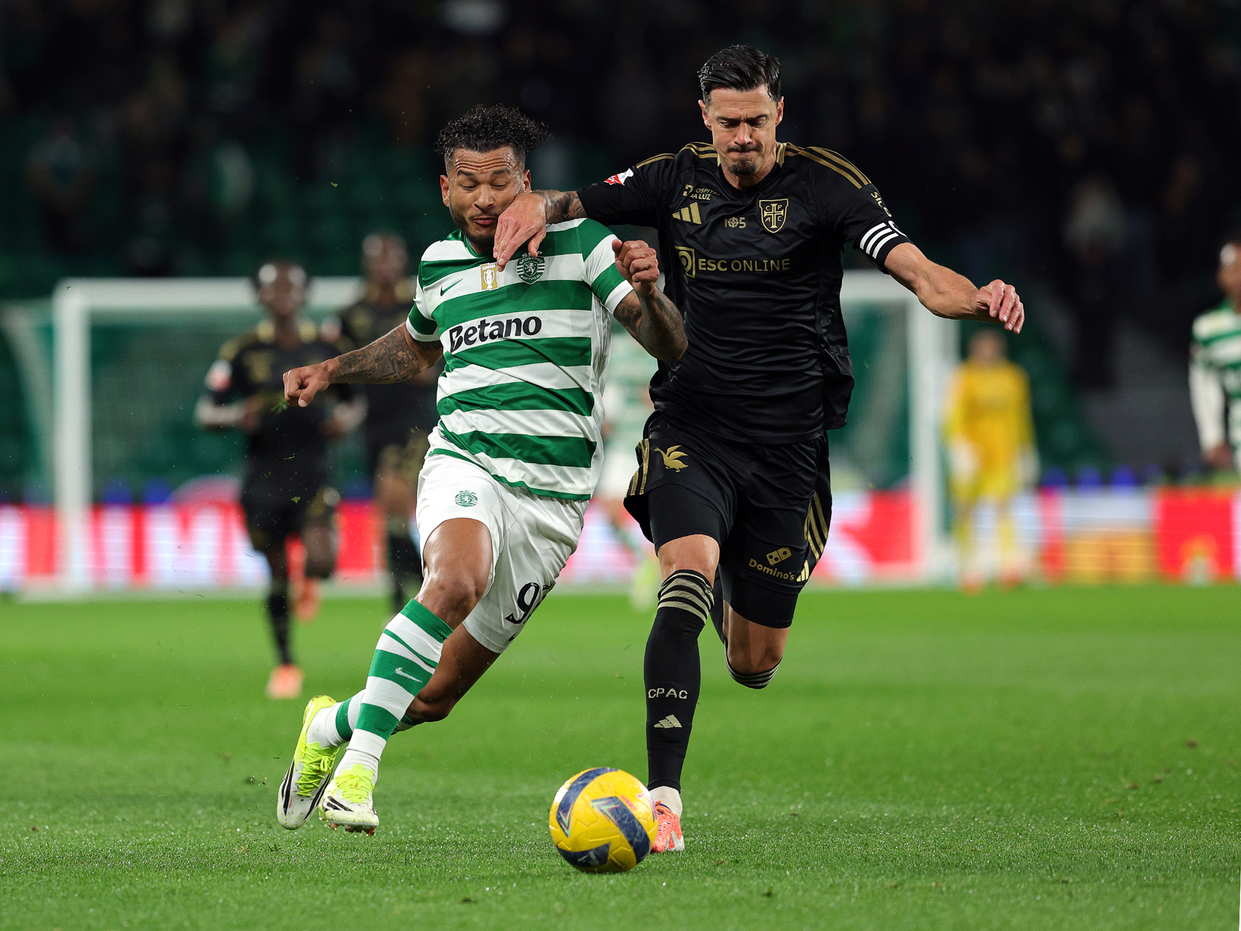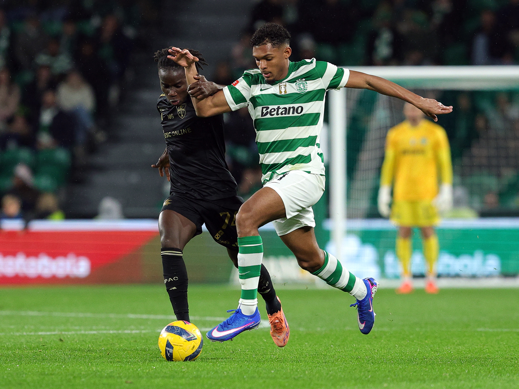 A ausência da “maturidade” referida aconteceu por causa dos dois primeiros golos leoninos, porquanto foram uma “fotocópia” quase perfeita, com Geny Catamo a lançar-se por aí fora, da defesa da sua equipa até à grande área do adversário, que não conseguiu travar o médio do clube de Alvalade, que (38’) entrou pela direita na zona vermelha e rematou de pronto, tendo a bola batido ainda num defesa casapiano e traído o guardião Patrick Sequeira, no que poderia ter sido um golo atribuído a quem fez o desvio da bola.