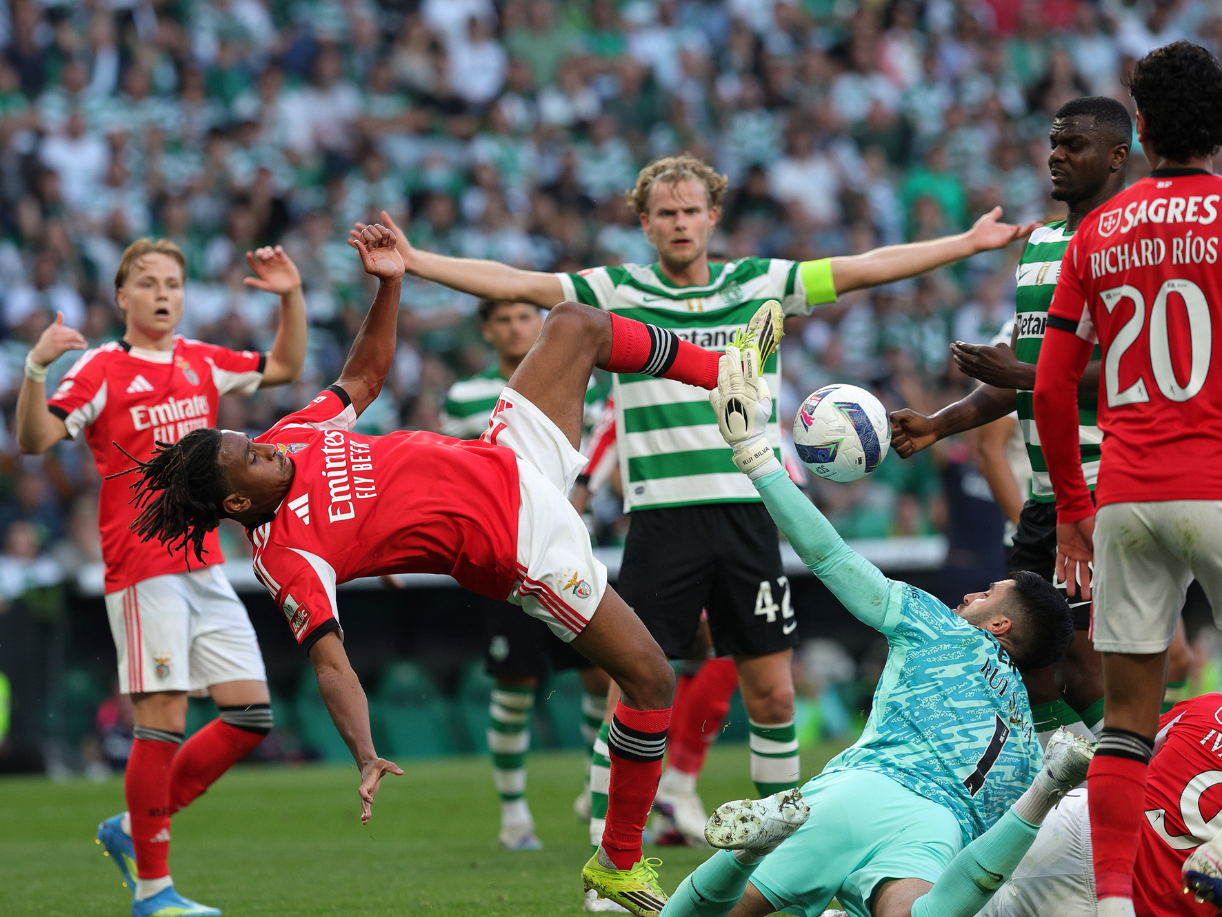 E o primeiro momento grande do jogo surgiu (14’) quando Trincão, em luta com Aursnes se “amarram”, caiem os dois dentro da grande área benfiquista e faltava ver o que diria o VAR, cinco minutos depois, confirmando que o jogar pisou o pé do sportinguista e assinalou a marca de grande penalidade. No cumprimento da missão, Luis Suàrez rematou rasteiro, denunciado, Trubin adivinhou para onde ia e desviou bem a bola para fora.